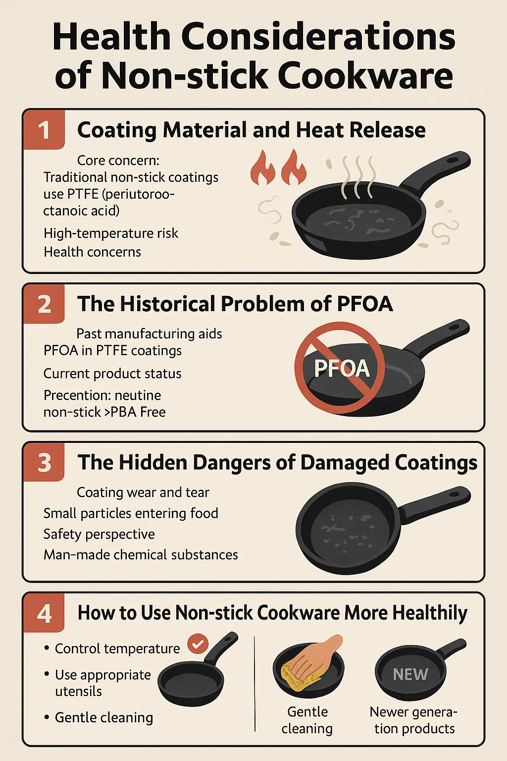 ورود ذرات ریز به غذا: هنگامی که پوشش آسیب می بیند، قطعات ریز پوشش ممکن است در طول پخت با غذا مخلوط شوند. دیدگاه ایمنی: اگرچه این قطعات به طور کلی بی اثر در نظر گرفته می شوند (یعنی جذب یا واکنش شیمیایی در بدن ندارند و دفع می شوند)، اما هنوز هم مواد شیمیایی ساخته دست بشر هستند. بنابراین، اگر یک تابه نچسب خراش یا پوسته شدن قابل توجهی روی روکش نشان داد، جایگزینی آن با ظرف جدید گزینه مطمئن تری است.