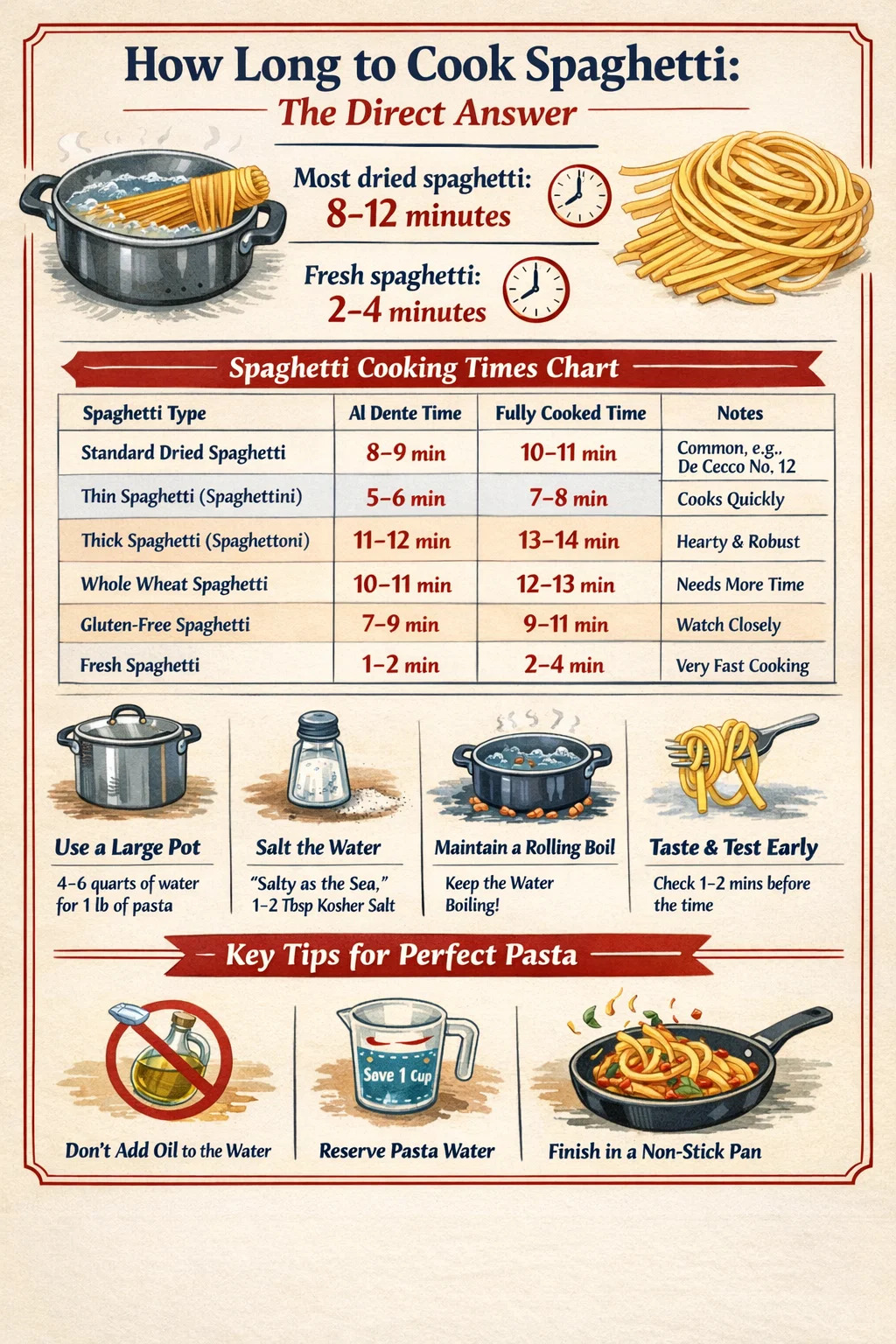 بیشتر اسپاگتی خشک شده مصرف می کند 8 تا 12 دقیقه بسته به ضخامت و بافت دلخواه شما در آب نمک جوش بپزید. برای al dente - استاندارد طلایی در آشپزی ایتالیایی - هدف را در انتهای بسته بندی قرار دهید، معمولاً حدود 8 تا 9 دقیقه. اسپاگتی تازه خیلی سریعتر پخته می شود، معمولاً فقط در مدت 2 تا 4 دقیقه . اسپاگتی سبوس دار اغلب به 10 تا 12 دقیقه کامل نیاز دارد تا به درستی نرم شود بدون اینکه صمغی شود.