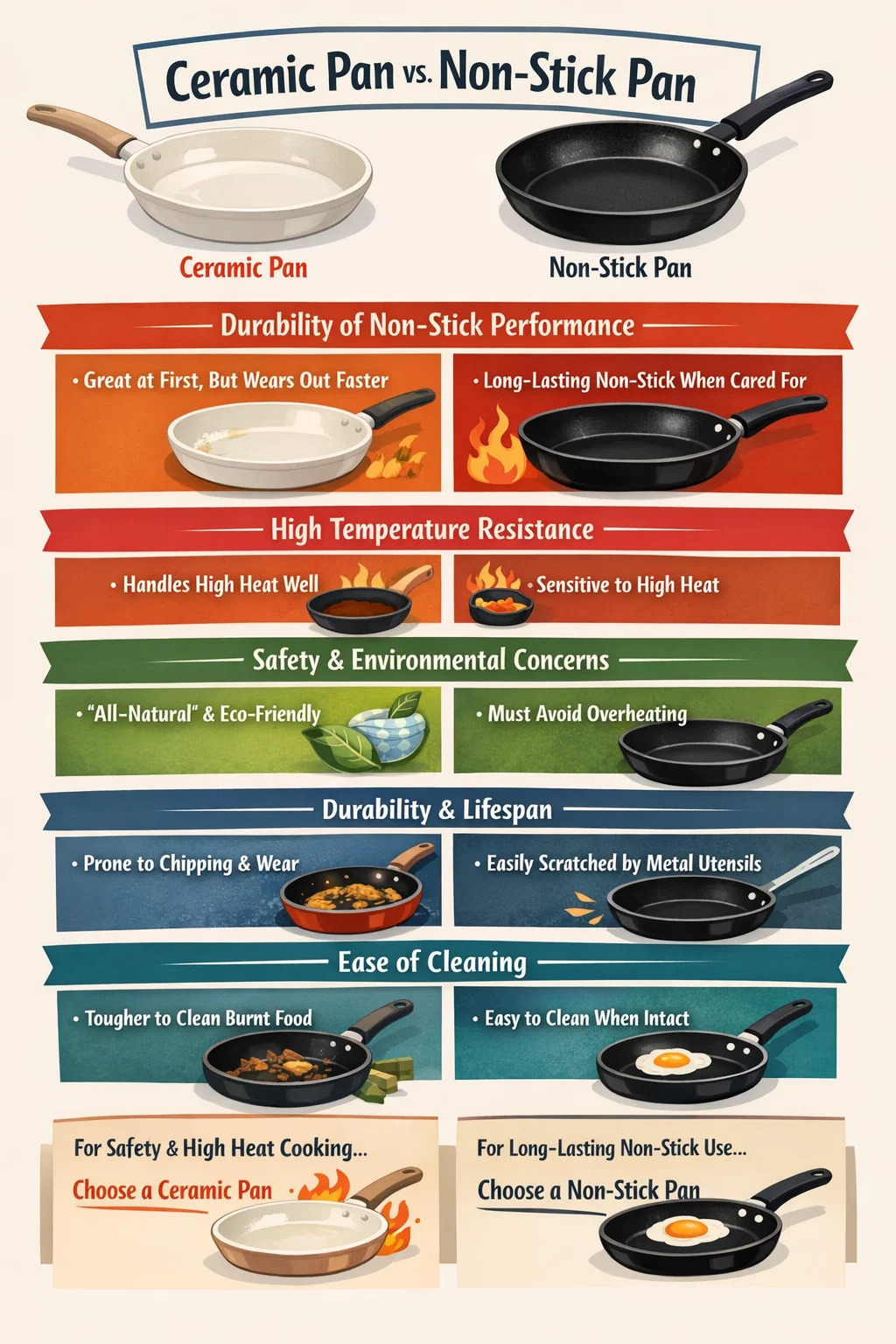 اگر در مورد مواد تشکیل دهنده پوشش بسیار نگران هستید، یا گهگاه نیاز به پختن در دمای بالا دارید، و مشکلی ندارید که ظروف آشپزی را هر شش ماه یا بیشتر تعویض کنید، پس ظروف سرامیکی زیباتر گزینه بهتری هستند.