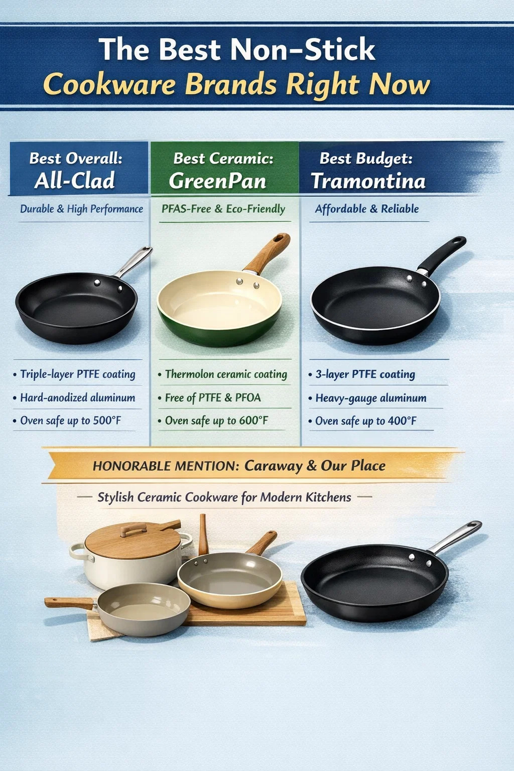 | GreenPan | سرامیک (ترمولون) | 40 تا 120 دلار | تا 600 درجه فارنهایت | مدل ها را انتخاب کنید | آشپزهای بدون PFAS و سازگار با محیط زیست |